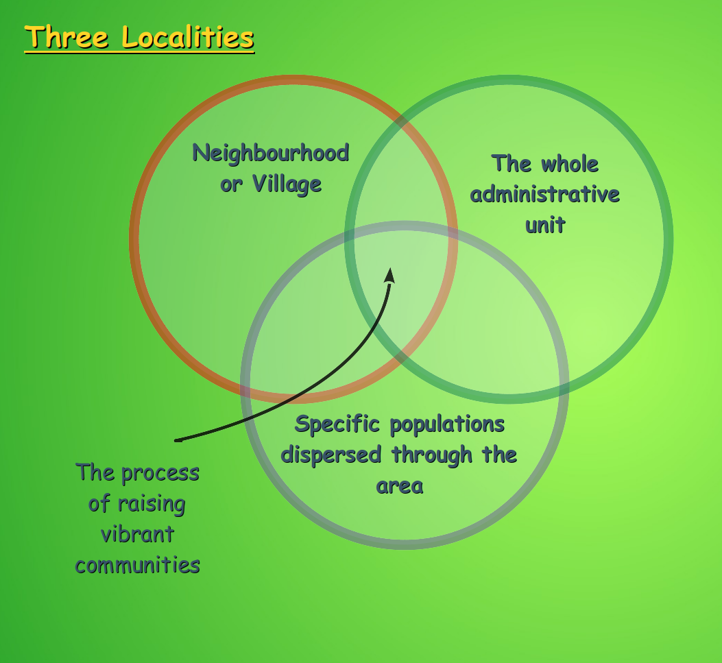 It is through this 'Institute Process' that the coordinated efforts of the Three Protagonists, in the Three Localities or settings enact the Three Endeavours to fulfill the needs of the population. It is in this way that the Insititute Process facilitates coherence of all the efforts of the three protagonists in community development.