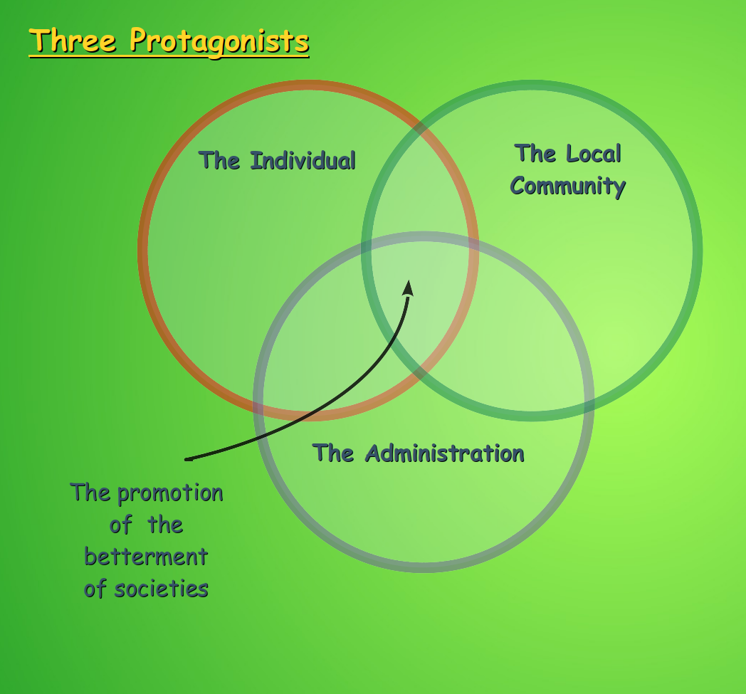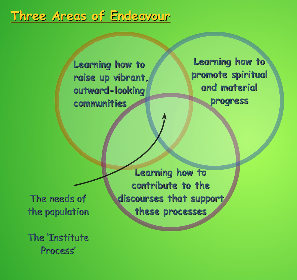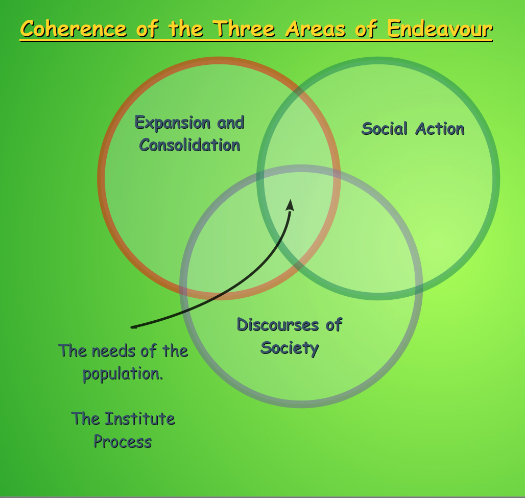 It is through this 'Institute Process' that the coordinated efforts of the Three Protagonists, in the Three Localities or settings enact the Three Endeavours to fulfill the needs of the population. It is in this way that the Insititute Process facilitates coherence of all the efforts of the three protagonists in community development.